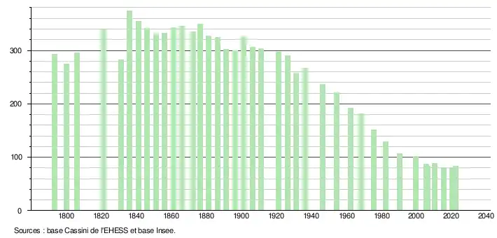 L'évolution du nombre d'habitants est connue à travers les recensements de la population effectués dans la commune depuis 1793. Pour les communes de moins de 10 000 habitants, une enquête de recensement portant sur toute la population est réalisée tous les cinq ans, les populations de référence des années intermédiaires étant quant à elles estimées par interpolation ou extrapolation[17]. Pour la commune, le premier recensement exhaustif entrant dans le cadre du nouveau dispositif a été réalisé en 2005[18].