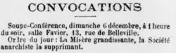 Convocation à la soupe conférence du 6 décembre 1891 où Séverine et Martinet interviennent, La Révolte.