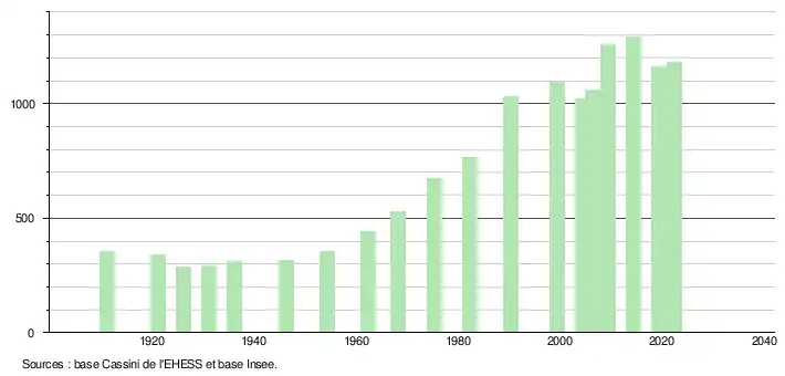L'évolution du nombre d'habitants est connue à travers les recensements de la population effectués dans la commune depuis 1911. Pour les communes de moins de 10 000 habitants, une enquête de recensement portant sur toute la population est réalisée tous les cinq ans, les populations de référence des années intermédiaires étant quant à elles estimées par interpolation ou extrapolation[26]. Pour la commune, le premier recensement exhaustif entrant dans le cadre du nouveau dispositif a été réalisé en 2004[27].