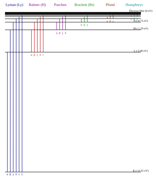 Ce spectre d'émission est composé de longueurs d'onde discrètes dues à la désexcitation d'un électron d'un niveau haut à un niveau bas. Les valeurs sont données par la formule de Rydberg :