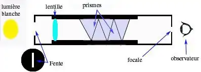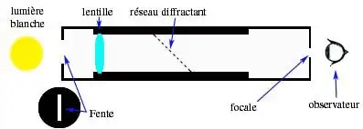 Le spectroscope est constitué d'un tube. À une extrémité du tube se trouve la focale par laquelle regarde l'observateur, à l'autre extrémité, une fente.