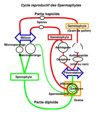 - en rouge, la phase haploïde ne comprend plus de stade libre en dehors du grain de pollen qui correspond à un gamétophyte mâle immature. Le gamétophyte femelle se développe tout entier sur le sporophyte ; les deux formeront après fécondation une structure complexe, la graine, qui comporte des tissus de 3 origines.