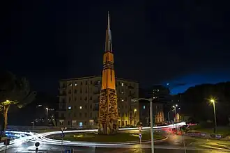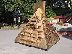 Quelques variantes géométriques en formes de disque, cône, tétraèdre, pyramide, triangle ou de cube exposées dans divers lieux du monde.