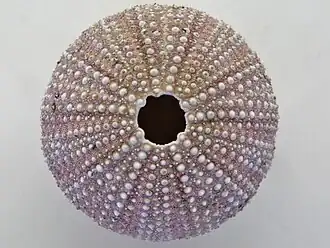 Sur l'animal mort, le test débarrassé des radioles laisse voir leurs nombreux mamelons d'insertion arrondis, auxquels il doit son nom. Le test nu est généralement rose pâle uni[3].