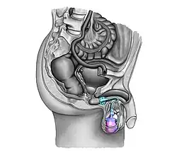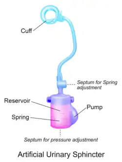 - Le sphincter urinaire artificiel avec ballon-réservoir constitué de trois composants: Une manchette, une pompe et un ballon-réservoir. La manchette est placée autour de l'urètre; la pompe est placée dans le scrotum et le ballon-réservoir est implanté dans l'espace rétro-pubien, entre la vessie et la veine iliaque. Le dispositif est rempli de solution saline stérile. La pression dans le circuit hydraulique est générée par la paroi élastique du ballon-réservoir et par la pression rétro-pubienne comprimant le ballon-réservoir[1],[2].