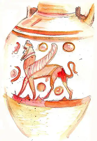 C'est la représentation d'un être mythique, la désignation féminine du Sphinx, un être composite (corps de lion, buste de femme, ailes d'oiseau), dont l'origine mythologique est grecque, introduite, par les échanges commerciaux, dans la culture de leur période archaïque.