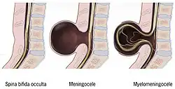 Le spina bifida (du latin signifiant « épine fendue en deux ») est une malformation liée à un défaut de formation des arcs vertébraux, un défaut de fermeture du tube neural (système nerveux primitif - défaut de fermeture du neuropore postérieur) et une ouverture du canal médullaire en bas du dos durant la quatrième semaine de la vie embryonnaire[1]. Le plus souvent, cette malformation concerne l'extrémité caudale et donc la région sacrée, voire lombaire ; il en résulte l'absence de l'apophyse épineuse d'une ou plusieurs vertèbres[2]. La protrusion des méninges par cette ouverture donne un méningocèle. De gravité variable, ces malformations vont du spina bifida occulta, très majoritairement non diagnostiqué et bénin ou entraînant des troubles légers, au myéloméningocèle, lorsqu'il y a protrusion de moelle spinale avec les méninges. Le spina bifida aperta non occulta, qui regroupe le myéloméningocèle, le méningocèle et le spina bifida à moëlle ouverte, concerne cinq naissances sur 10 000[3].