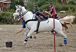 - Horse-ball : sport collectif inventé en France à la fin des années 1970. Mélange de rugby et de basket, il s’inspire tout à la fois du pato argentin, du bouzkachi afghan et de jeux équestres pratiqués dans les années 1930 par des cavaliers de la Garde républicaine. Deux équipes de six cavaliers, dont deux remplaçants, s'affrontent sur un terrain de 70x30m. Elles doivent envoyer un ballon dans le but adverse situé à l'extrémité du terrain après un jeu de passes. Les équipes doivent défendre leur panier (un cerceau vertical placé à 3,5 mètres du sol) contre les buts de l'équipe adverse. Les règles sont simples : ne pas garder le ballon dans les mains plus de 10 secondes, faire 3 passes avant de pouvoir marquer un but, ne pas descendre de cheval pour ramasser le ballon… Le ballon est maintenu dans un harnachement de cuir comprenant des poignées solides qui permettent à la fois l'arrachage et sa récupération au sol sans descendre de cheval, mais en se penchant. Au niveau international, le horse-ball est géré par la FIHB, Fédération Internationale de Horse Ball[18].