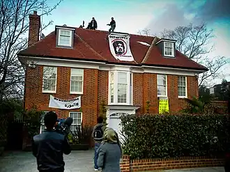 Un groupe d'activistes appelé Topple the Tyrants a squatté une maison appartenant à Saïf al-Islam Kadhafi, fils du dirigeant libyen Mouammar Kadhafi, en mars 2011[80]. Il s'agissait d'un manoir de huit chambres à coucher dans la banlieue de Hampstead Garden, qui avait été mis en vente pour 12,75 millions d'euros lorsque la guerre civile libyenne de 2011 a commencé[81].