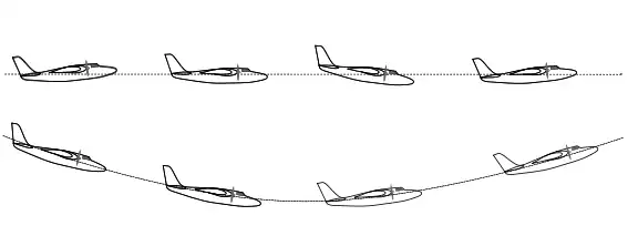Ainsi l'attitude et la trajectoire sont affectés simultanément après la perturbation initiale. On peut mettre en équations[13] l'évolution de , de la pente et de la vitesse. La solution de ces équations montre que le retour à l'équilibre se fait par une superposition de deux modes d'oscillations, dits modes "propres". Un de ces modes est une oscillation de tangage où la trajectoire est peu affectée, l'autre est une oscillation de trajectoire dite oscillation phugoïde où l'angle d'incidence est peu affecté.