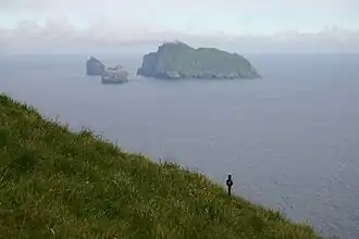 Vue de Stac Lee (à droite) et de Boreray (à gauche) depuis l'ouest en 2009 avec le sommet biseauté de Stac Lee.