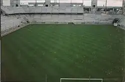 Alors que le site n'est encore qu'un terrain vague, la première phase des travaux consiste à creuser un trou de 120 mètres par 80 mètres destiné à recevoir la pelouse, qui est plantée bien avant le début de la construction des tribunes[13]. 150 000 mètres cubes de terre sont excavés[14] et les travaux de terrassement sont terminés à la fin du mois de .