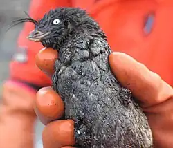 Starique cristatelle recouverte de pétrole après le naufrage du MV Selendang Ayu