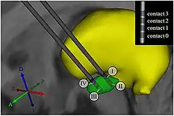 La cible peut être le noyau sous-thalamique ou le globus pallidus, les deux sites étant équivalents du point de vue de l'efficacité[8]. Elle peut être unilatérale ou bilatérale en cas de résultats insuffisants[9].