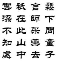 - ↑ Cet exemple reprend mot à mot le texte du poème en sigillaire de 賈島 Jiǎ Dǎo. Ce n'est pas l'œuvre d'un calligraphe mais un texte passé par une police de caractères spécifiques.