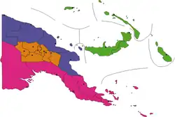 - Région Papouasie : province centrale, Golfe, Baie Milne, Province nord, province ouest et district de la Capitale nationale