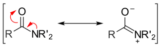 Un autre facteur qui joue un rôle dans la réactivité des composés acyle est la mésomérie. Les amides présentent deux formes mésomères, chacune contribuant à la forme réelle de la molécule, si bien que la liaison amide entre l'atome de carbone du groupe carbonyle et l'atome d'azote possède un caractère important de liaison double. La barrière énergétique à la rotation autour de la liaison amide est de 75–85 kJ/mol, bien plus grande que les valeurs observées pour les liaisons simples. Par exemple, pour la liaison simple C-C de l'éthane, la barrière énergétique est seulement de 12 kJ/mol[3]. Lorsqu'un nucléophile attaque un amide formant l'intermédiaire tétraédrique, cet effet mésomère énergétiquement favorable disparaît. Ceci aide à comprendre pourquoi les amides sont parmi les moins réactifs des dérivés acyle[4].