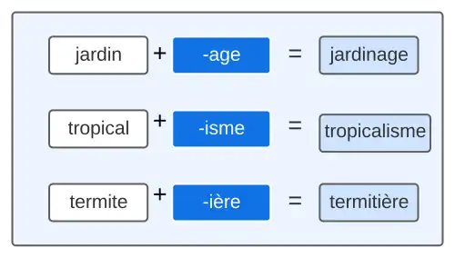 ex. Mot : nature (n.). Suffixe dérivationnel : naturel/naturelle (adj.)