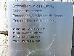 - (de) Cet article est partiellement ou en totalité issu de l’article de Wikipédia en allemand intitulé « Schweizer des Jahres » (voir la liste des auteurs).