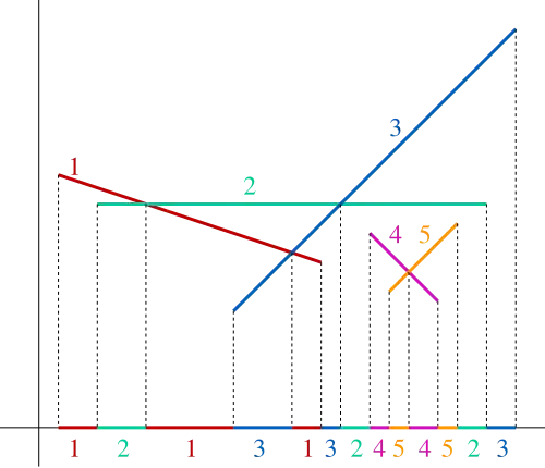 Ce même concept d'enveloppe basse peut aussi être appliqué aux fonctions qui sont continues par morceaux ou définies seulement sur des intervalles de la droite réelle. Cependant, dans ce cas, les points de discontinuités des fonctions et des extrémités de l'intervalle dans lequel chaque fonnction est définie ajoute à l'ordre de la suite. Ainsi un segment de droite non vertical dans le plan peut être considéré comme le graphe d'une fonction liant un intervalle de x valeurs aux valeurs y correspondantes, et l'enveloppe basse d'un ensemble de segments de droite forme une suite de Davenport–Schinzel d'ordre trois car toute paire de segments de droite peut former une sous-suite alternative avec une longueur d'au plus quatre.