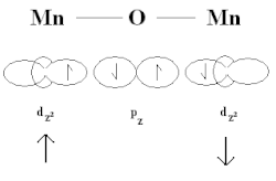Les orbitales p de l'oxygène et les orbitales d du manganèse peuvent faire un échange direct. Il y a de l'ordre antiferromagnétique parce que l'état singulet est favorisé du point de vue de l'énergie. Cette configuration permet la délocalisation des électrons impliqués qui diminue leur énergie cinétique.