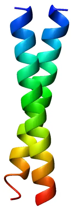 Une superhélice, ou coiled coil, est un motif structurel de protéines dans lequel de deux à sept[3] hélices α sont enroulées ensemble les unes autour des autres — les dimères et les trimères sont les structures les plus fréquentes. Des protéines présentant ce type de structures sont impliquées dans des fonctions biologiques importantes, par exemple les facteurs de transcription dans l'expression génétique. Les oncoprotéines c-Fos et c-Jun (en), de même que la tropomyosine, sont des exemples notables de telles protéines.