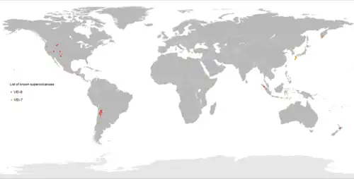 Liste des événements volcaniques de niveau 8 depuis le début du Quaternaire (-2,58 millions d'années), d'après la base de données Volcano Global Risk Identification and Analysis Project[7], par ordre chronologique (entre parenthèses, le volume de téphras éjectés)  :