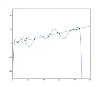 Si l'on autorise un ensemble de fonctions d'apprentissage plus grand, par exemple l'ensemble des fonctions polynomiales à coefficients réels, il est possible de trouver un modèle décrivant parfaitement les données d'apprentissage (erreur d'apprentissage nulle). C'est le cas du polynôme d'interpolation de Lagrange : il passe bien par tous les points verts mais n'a visiblement aucune capacité de généralisation.