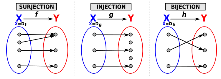- S'il existe une surjection de X dans Y, alors (d'après ce qui précède, donc en admettant l'axiome du choix) il existe une injection de Y dans X, autrement dit l'ensemble X a au moins autant d'éléments que l'ensemble Y, au sens des cardinaux.