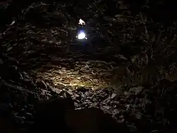 Vue de l'entrée de la Surtshellir dans le Hallmundarhraun avec au dernier plan Strútur.
