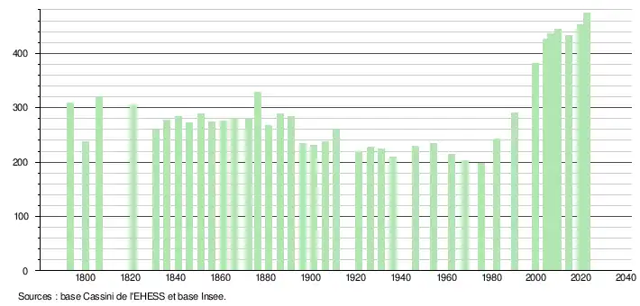 L'évolution du nombre d'habitants est connue à travers les recensements de la population effectués dans la commune depuis 1793. Pour les communes de moins de 10 000 habitants, une enquête de recensement portant sur toute la population est réalisée tous les cinq ans, les populations de référence des années intermédiaires étant quant à elles estimées par interpolation ou extrapolation[23]. Pour la commune, le premier recensement exhaustif entrant dans le cadre du nouveau dispositif a été réalisé en 2004[24].