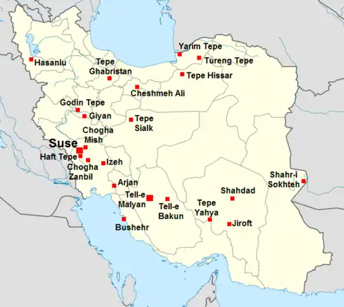 La Susiane d'avant Suse connaît déjà quelques agglomérations fondées au Néolithique : le plus ancien village fouillé dans la région est Chogha Bonut, habité vers la fin du VIIIe millénaire av. J.-C.[29], puis d'autres sites plus importants émergent vers la fin du VIe ou au début du Ve millénaire av. J.-C. (chalcolithique) : chronologiquement Djafarrabad, Djowi et Bendebal, puis Chogha Mish[30]. Suse naît donc dans une région déjà avancée dans le processus des débuts de l'urbanisation, et ce site illustre un nouveau stade dans l'affirmation du fait urbain, et la marche vers l'apparition de l’État. Elle balance entre les influences de la Basse Mésopotamie voisine, qui est alors une région motrice dans le développement des institutions étatiques, de l'urbanisation, de l'écriture, et celles des cultures du plateau Iranien qui connaissent des évolutions similaires. La culture matérielle susienne présente de ce fait un profil diversifié, reflétant les contacts de ses habitants avec les régions voisinant la Susiane et même parfois d'autres, plus lointaines.