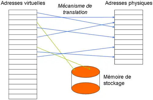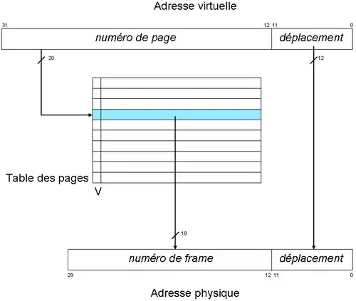 - Un mécanisme de traduction (translation, ou génération d'adresse) assure la conversion des adresses virtuelles en adresses physiques, en consultant une table des pages (page table en anglais) pour connaître le numéro du cadre qui contient la page recherchée. L'adresse physique obtenue est le couple (numéro de cadre, déplacement).
