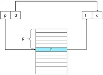 - la segmentation paginée, où chaque segment sera paginé. Autrement dit, le champ déplacement d du couple (s, d) de l'adresse virtuelle sera interprété comme un numéro de page et un déplacement (p, d’).
