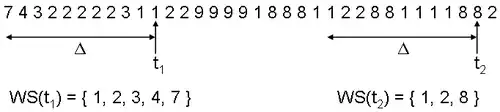 On peut définir un paramètre, Δ, qui est le nombre de références aux pages accédées par le processus durant un certain laps de temps. La figure ci-dessous montre la valeur de l'espace de travail à deux instants différents :