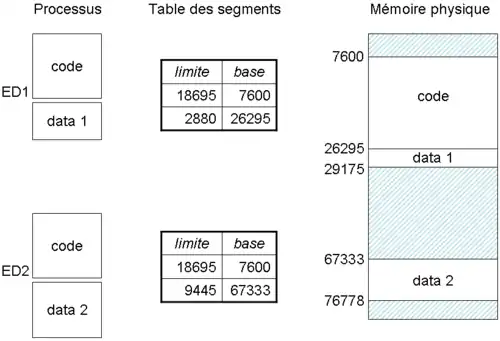 Il est possible de partager des segments entre processus, comme illustré sur la figure ci-dessous, où deux processus Ed1 et Ed2 partagent le même segment de code (programme) mais ont des segments pour les données disjoints et de tailles différentes.