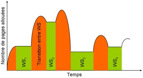 Les « plateaux » sont des zones où il n'y a pas de défaut de page : l'espace alloué est suffisamment grand pour contenir toutes les frames dont le processus a besoin pendant un temps relativement long. Les défauts de pages ont lieu dans la partie ascendante de la transition, tandis que de la mémoire est libérée quand la courbe retombe vers le prochain espace de travail : zone d'équilibre.