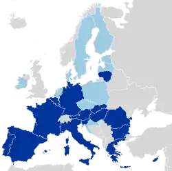 L'euro est devenu un symbole depuis qu'il a remplacé douze monnaies nationales en 2002 et est devenu de jure la monnaie unique de l'union économique et monétaire[11]. Il est maintenant utilisé dans 19 États membres de l'UE, ainsi que dans d'autres pays européens et il est devenu (avec son symbole monétaire : €) l'un des symboles les plus tangibles de l'unité européenne pour ses citoyens.