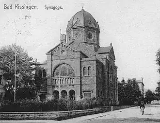 La synagogue de Bad Kissingen a été construite en 1902 ; comme la majorité des synagogues en Allemagne, elle sera détruite par les nazis en 1938.