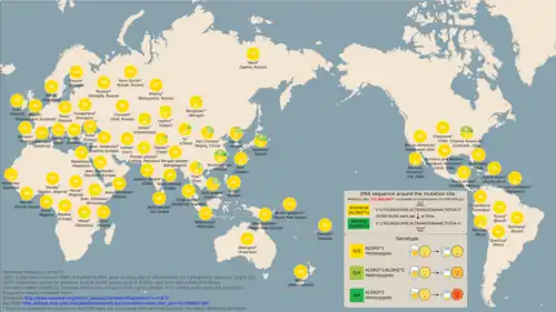Chez environ 50 % des Asiatiques de l'Est, l'accumulation accrue d'acétaldéhyde est aggravée par une autre variante du gène, l'allèle mitochondrial ALDH2, ce qui entraîne une moindre fonctionnalité de l'enzyme d'acétaldéhyde déshydrogénase, responsable de la dégradation de l'acétaldéhyde[9]. Le résultat est que les personnes touchées peuvent mieux métaboliser l'alcool, ne ressentant souvent pas le même désagrément à l'alcool que les autres, mais montrent beaucoup plus d'effets secondaires à base d'acétaldéhyde en buvant de l'alcool.