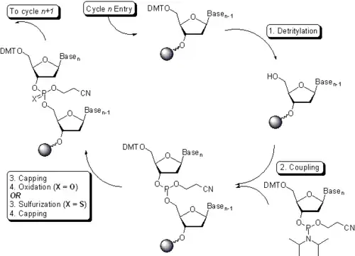Les nucléotides sont ajoutés un à un, en cycles successifs. Ils sont ajoutés sous forme de synthons protégés du côté 5' par un groupement dimethoxytrityl et du côté 3', l'atome de phosphore est sous forme de 2-cyanoéthyl-phosphoramidite (phosphite triester).