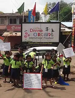 - Groupe de jeu (pré-maternelle) : Dans les garderies, les enfants sont exposés à de nombreuses activités d'apprentissage basiques qui les aident à devenir indépendants plus rapidement et à développer leurs qualités d'auto-assistance, comme manger eux-mêmes, s'habiller et rester propre. L'âge limite d'admission en pré-maternelle est de deux à trois ans. L'anganwadi est un programme de nutrition et d'apprentissage gratuit pour les enfants en milieu rural et les soins maternels, financés par le gouvernement, incluent le repas de midi [45]