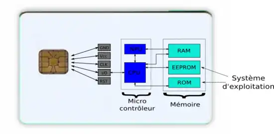 Une carte à puce ou smart card est constituée d'un CPU, de mémoire RAM (ses données seront perdues quand celle-ci sera retirée du lecteur), d'une mémoire ROM (où est pré-enregistré en usine le système d'exploitation), et d'une EEPROM (qui conserve les données qui y sont inscrites même après que la carte n'est plus électriquement alimentée). En cela, il s'agit d'un ordinateur classique, réduit à la taille d'une puce.