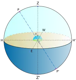 - Le système de coordonnées horaires se déduit du système de coordonnées horizontales par une rotation autour de l'axe Est-Ouest, dont l'amplitude est de 90° moins la latitude. Cette rotation est celle qui ramène le zénith du lieu sur l'axe des pôles. Autrement dit, au pôle nord, l'angle d'élévation se confond avec la déclinaison, et l'azimut se confond avec l'angle horaire.