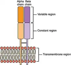 - Le site de fixation de l’antigène est composé de deux chaînes : alpha et beta, avec une partie variable et une partie constante. Ce site, à la différence du site antigénique des BCR, ne reconnaît qu'un type de molécule, les peptides, et à condition que ceux-ci soient présentés par un complexe majeur d’histocompatibilité (CMH). Cette complexité assure que l'organisme ne réagit pas contre ses propres peptides[9].