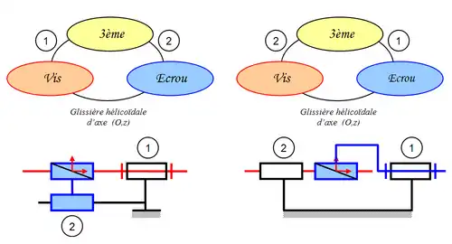 Nous avons donc deux familles de solutions structurellement symétriques : vis guidée en rotation et écrou guidé en translation, ou bien vis guidée en translation et écrou guidé en rotation.
