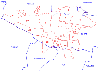 La municipalité de Téhéran (shahrdāri) est divisée en 22 arrondissements (mantagheh) municipaux, disposant chacun de son centre administratif. Les arrondissements sont numérotés pour être identifiés, comme sur le plan ci-contre. Téhéran est divisée en 112 quartiers (nāhiyeh) dont les principaux sont rappelés ci-après[16] :