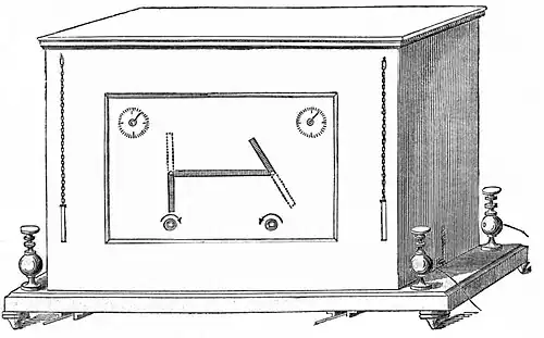 Le télégraphe de Foy et Breguet a été inventé par Alphonse Foy et Louis Breguet en 1842, et utilisé en France. L'affichage de l'instrument était disposé de manière à imiter le système télégraphique optique français, les deux aiguilles prenant les mêmes positions que les bras du sémaphore Chappe, qui est largement utilisé en France. Grâce à cet arrangement, les opérateurs n'avaient pas besoin de suivre une nouvelle formation lorsque leurs lignes télégraphiques passaient au télégraphe électrique[45]. Le télégraphe de Foy et Breguet est généralement décrit comme un télégraphe à aiguilles, mais sur le plan électrique, il s'agit en fait d'un type de télégraphe à induit. Les aiguilles ne sont pas déplacées par un dispositif de galvanomètre. Ils sont au contraire mus par un mécanisme d'horlogerie que l'opérateur doit maintenir remonté. La détente du mécanisme d'horlogerie est libérée par une armature électromagnétique qui fonctionne sur les fronts d'une impulsion télégraphique reçue[46].