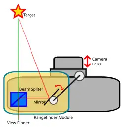 C'est à ce type de télémètre que l'on fait référence quand on parle d'appareil télémétrique. La distance est déterminée par triangulation entre deux fenêtres de visée produisant un effet de parallaxe. Les images vues par l'une et l'autre fenêtre sont amenées par un jeu de miroirs sur le même oculaire. On voit ainsi au centre du viseur les deux images superposées du sujet visé. Une commande modifiant l'orientation d'un composant optique intermédiaire permet de faire coïncider les deux images. Est ainsi mesuré l'angle au sommet du triangle formé par le sujet visé (sommet) et les deux fenêtres de visée (base). La distance correspondante (hauteur du triangle) est lue sur une graduation de la commande.