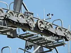 La tête du pylône se présente face à la ligne et reçoit, de part et d'autre, un balancier articulé regroupant une série de galets. La longueur du balancier (et donc le nombre de galets qui le composent) dépend de sa charge, qui est, en grande partie, fonction du changement de pente de la ligne au niveau du pylône. On trouve des balanciers dits de support, destinés à porter le câble, mais également des balanciers de compression qui rapprochent la ligne du sol fini, par exemple pour respecter les limitations légales de hauteur de survol des sièges ou assurer une reprise de pente[11]. Il existe par ailleurs des balanciers de support-compression, destinés à accompagner un profil de ligne légèrement concave lorsque, en fonction de la charge, l'appui du câble sur la partie support ou compression n'aurait pas été permanent[11].